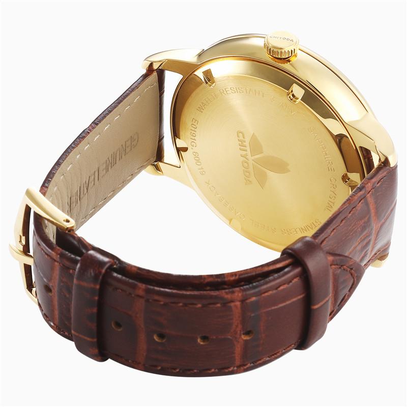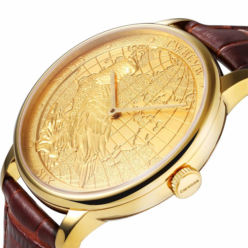 CHIYODA Men's Watch, Swiss Quartz Wrist Watch With Leather Strap, 24K Gold Plated With Carving Process Of Map And Eagle Pattern
