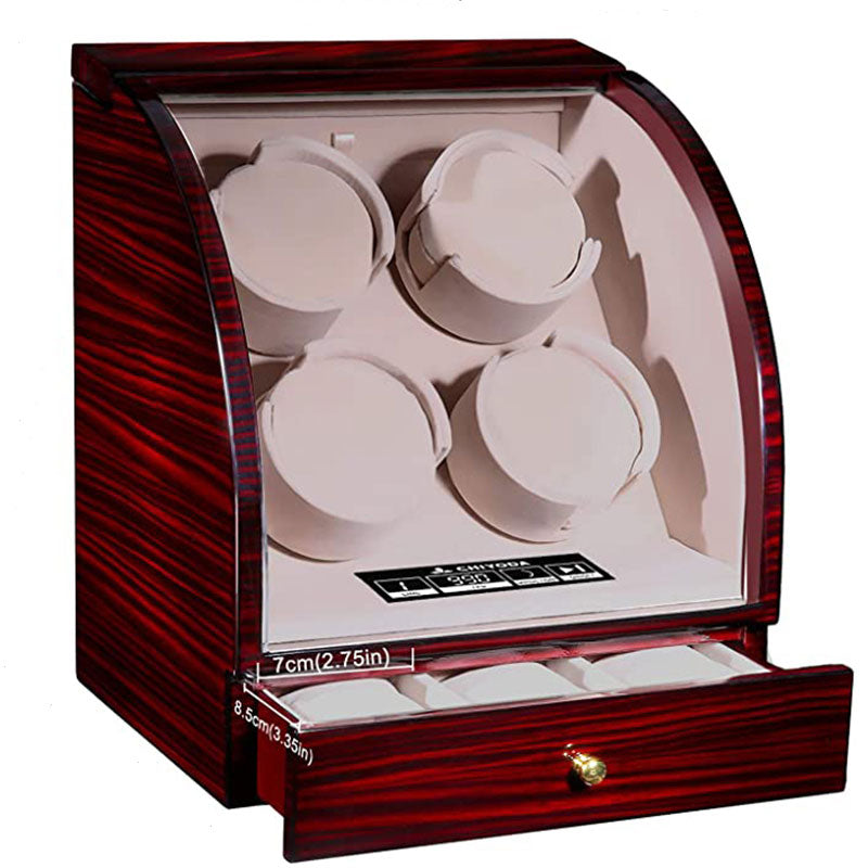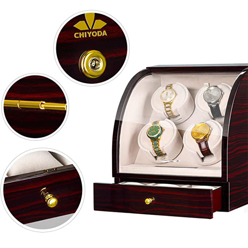 CHIYODA Quad Watch Winder Wooden Watch Box With Quiet Mabuchi Motor And 12 Rotation Modes, LCD Digital Display Independent Control, 3 Jewelry Storage