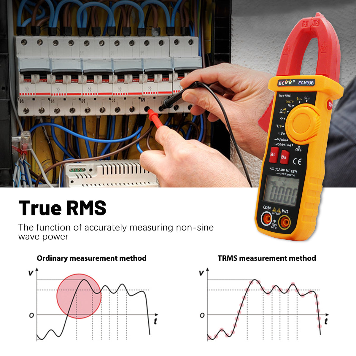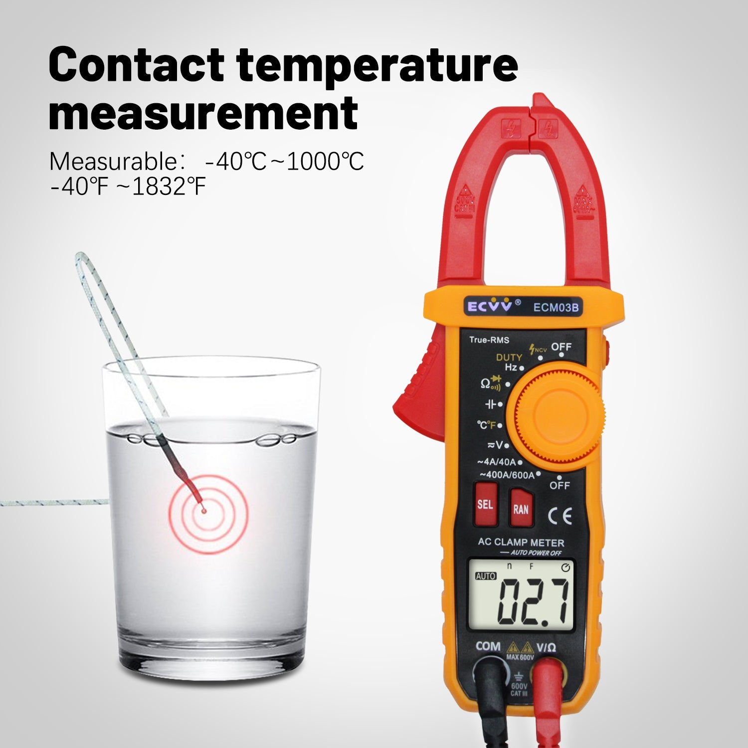 ECVV ECM03B true RMS digital clamp meter is a new-generation practical electrotechnical measurement meter which has the features of high reliability, high safety, automatic range,backlit display and handheld type, it can be used to measure voltage, current, resistance, capacitance, frequency, temperature, etc.And it has full-range overload protection and unique appearance design, is more excellent in performance, and is an ideal tool for detection, maintenance and repair of various universities and colleges, smelting, communication,manufacturing, petroleum, electrical, power and circuit equipment.