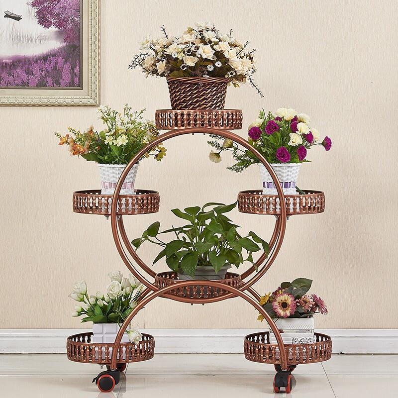 Flower Rack Multi-layer Indoor Space Saving Iron Multi-layer Flower Rack Balcony Storage Rack Living Room Belt Wheel Flower Pot Rack Red Copper 6 Basin Luxury Version (brake Universal Wheel)