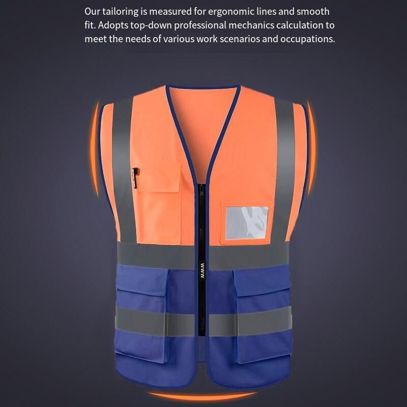 High Visibility Zipper Multi Pocket Reflective Vest Safety Warning Vest 4 Reflective Strips - Fluorescent Orange + Blue