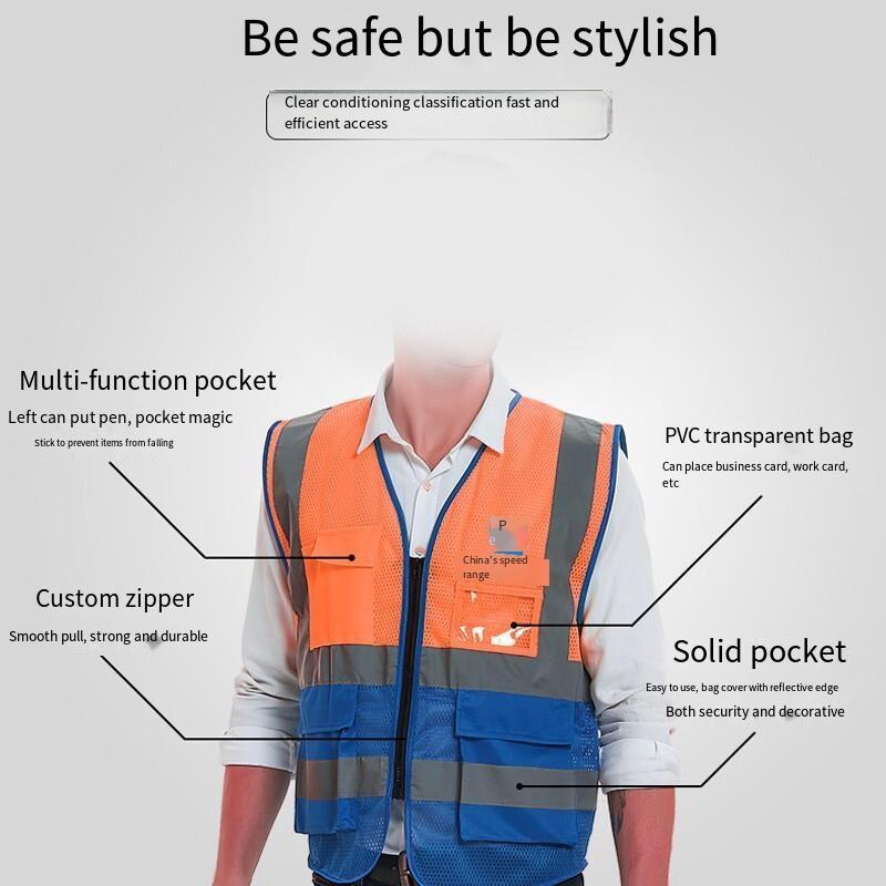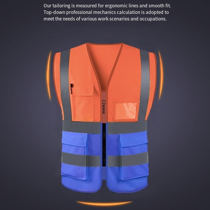 Highly Visibility Original Safety Vest with 4 Highly Reflective Strips Safety Zipper Breathable Fabric for Outdoor Work Jogging Sports - Orange + Blue