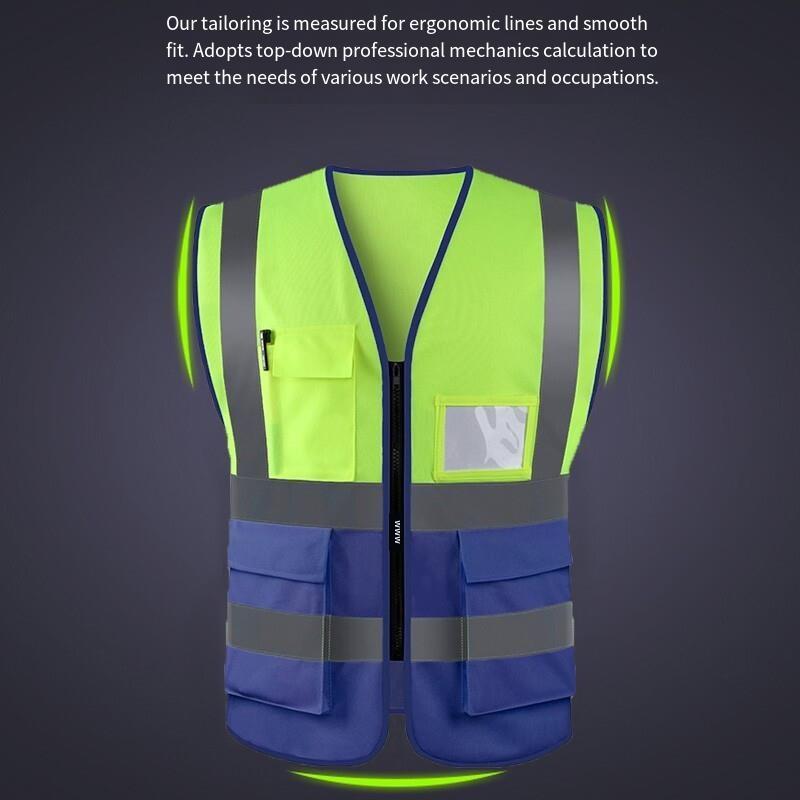 Multi Pocket Reflective Vest High Visibility Zipper Vest Safety Warning Vest 4 Reflective Strips - Fluorescent Yellow+ Blue