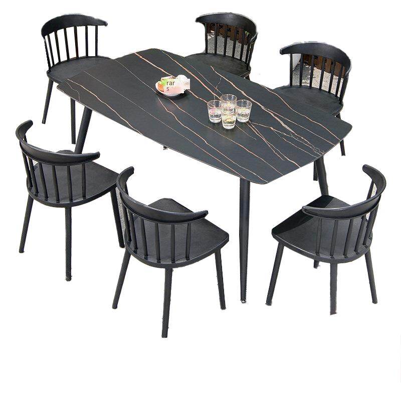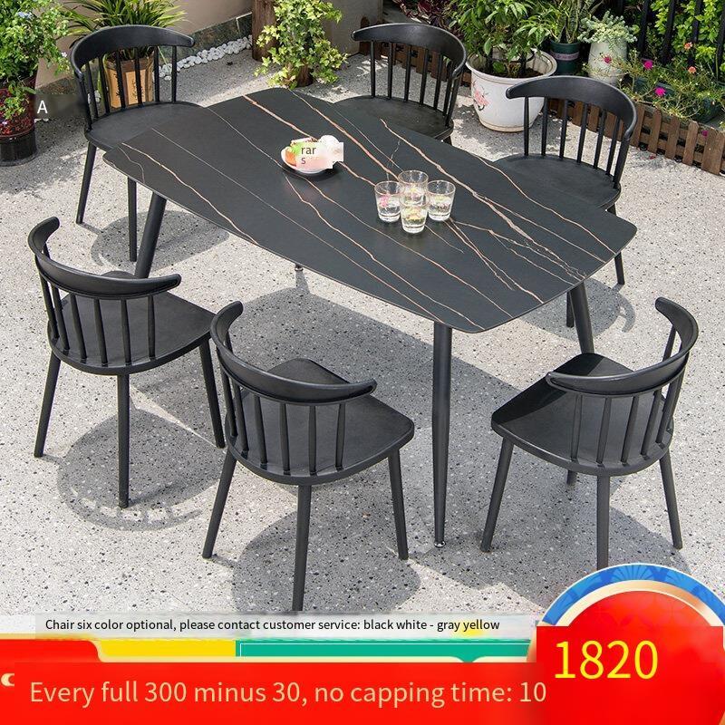 Outdoor Tables And Chairs Courtyard Balcony Garden Milk Tea Shop Rock Board Leisure Combination 6 + 1 [equipped With 16ocm Black Gold Pattern Rock Board Round Corner Long Table]