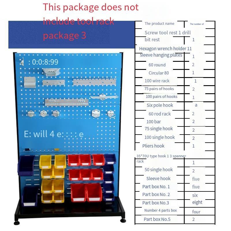 One screw holder, one drill bit holder, one inner hexagon wrench holder, one socket hanger plate, two 60 round hooks, one 80 round hook, one 100 wire frame, two 75 double hooks, one 100 double hook, one six bar hook, two 60 bar members, two 100 bar members, two 75 single hooks, two 100 single hooks, one clamp hook, three 30 * 70u hooks, one wrench holder, two 50 single hooks, five socket hooks, one single hook, No.1 parts boxes ×5 , No. 2 parts boxes × 6, No.3 parts boxes × 8, No.4 parts boxes × 4 and No.5 parts boxes × 2.